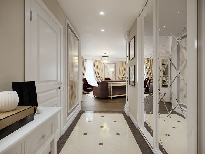 Холл мы наполнили белоснежными резными молдингами, моим авторским панно из мрамора и зеркалами с фацетами. Это безусловная классика, но в современном прочтении — именно то, что просили заказчики.
