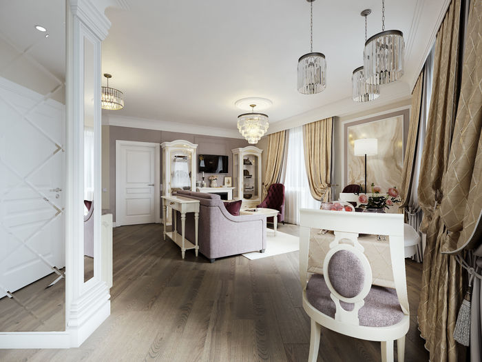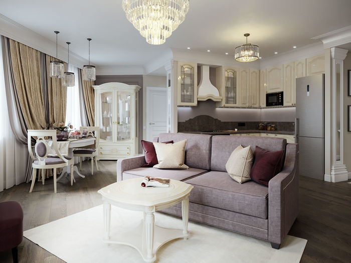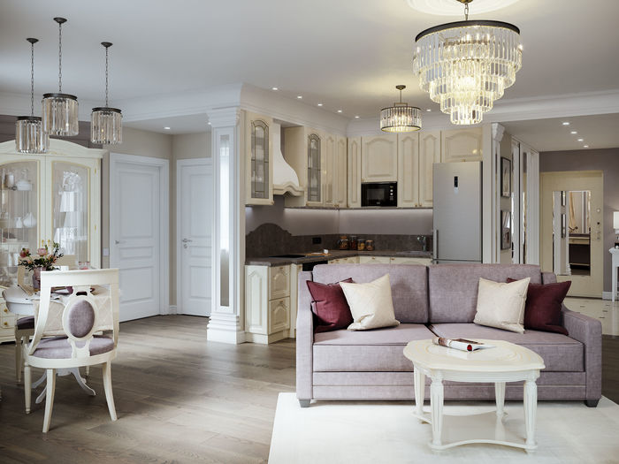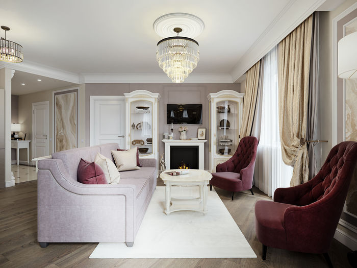 Эту кухню-гостиную мы создали в пудровых оттенках, полностью отвечающих стилистике всей квартиры. В зоне отдыха расставлены цветовые акценты — кресло и подушки, обитые бархатом винного цвета. Зонирование организовано с помощью правильно расставленной мебели — столовой группы и диванной; гостиную украшает камин. Текстиль для штор мы подбирали в также классическом стиле, но без излишней вычурности, поэтому он так идеально вписался в интерьер. Вечерами этот уголок дома становится центром сосредоточения всех домашних. Кухонный гарнитур, столовая группа, роскошный стеллаж для посуды и даже журнальный столик образуют великолепный ансамбль классической мебели, который дополняют мои любимые итальянские люстры из хрусталя.
