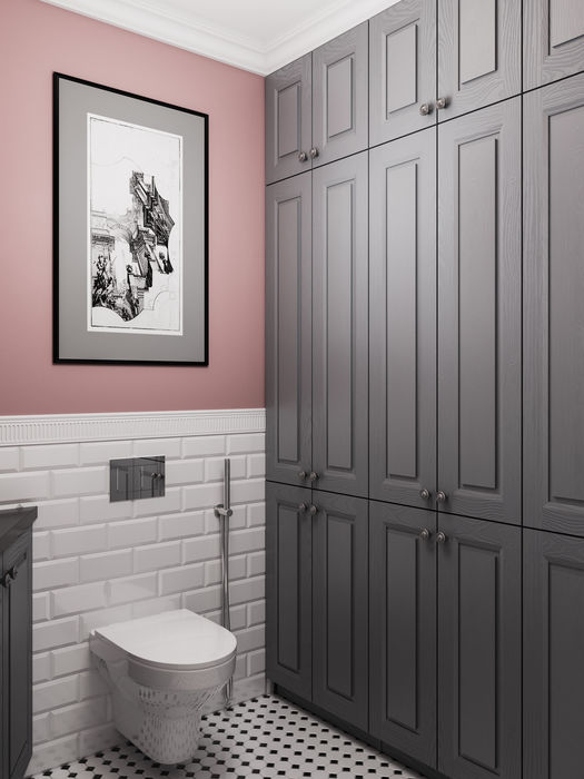 Особенностью этой квартиры стал выбор цветовой гаммы — каждая из комнат сосредоточила в своем дизайне один из пудровых тонов. Для мужской спальни выбор пал на приглушенный цвет мяты в сочетании с акцентами Шампань, искрящимися в хрустале светильников, и нежными оттенками брусники, окропившими часть текстиля. Остальные неотъемлемые детали классического интерьера, объемные молдинги и плинтус, резные фасады мебели и дверь, выполнены в традиционном белом цвете.